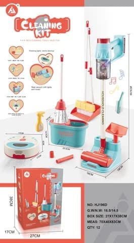 - 12 pcs Children’s cleaning toy set: The toy set includes a watering can, a brush, a broon, a dustpan, a sweeping robot, and a vacuum cleaner with three different nozzles and extension tubes. The box size is 38*27*17 cm.